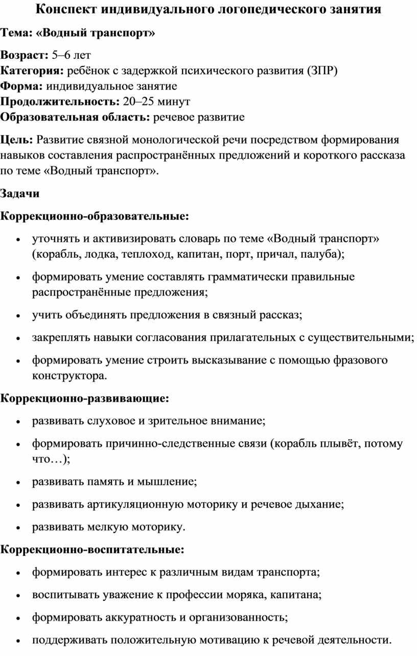Цель: Развитие связной монологической речи посредством формирования навыков составления распространённых предложений и короткого рассказа по теме «Водный транспорт».
