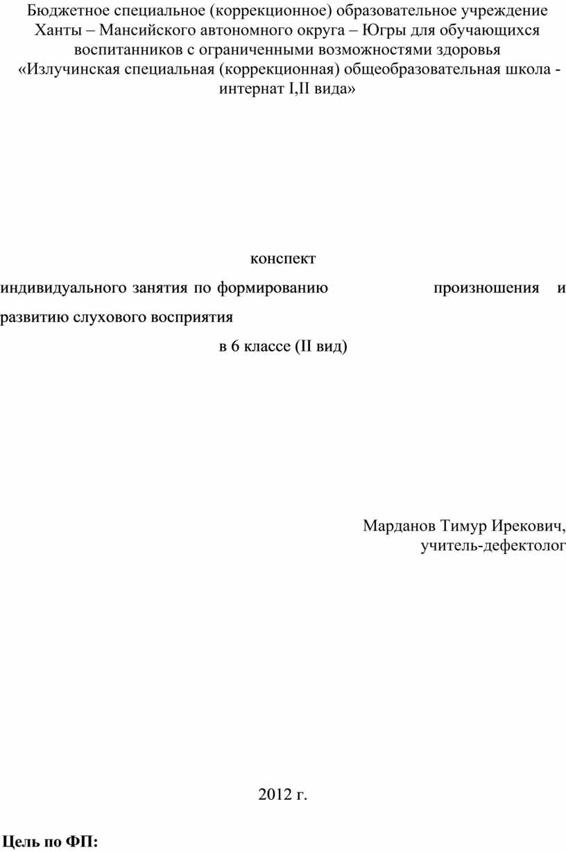 индивидуального занятия по формированию произношения и развитию слухового восприятия