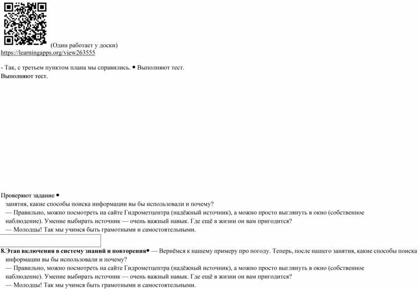 — Давайте разберёмся, в чём затруднение. У нас есть вопрос про погоду и есть много путей найти ответ. Но мы не всегда можем сказать: «Для этого вопроса лучший источник — вот этот». Иногда мы ищем долго, иногда находим неправильное. - Какую проблему мы должны сегодня решить? Значит, нам нужно научиться разбираться в видах информации и выбирать подходящий способ её поиска для каждой задачи. |