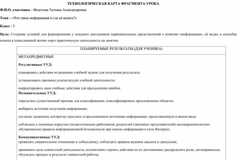 ТЕХНОЛОГИЧЕСКАЯ КАРТА ФРАГМЕНТА УРОКА