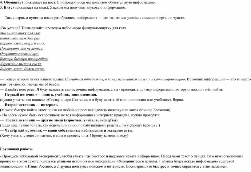 Цель: Создание условий для формирования у младших школьников первоначальных представлений о понятии «информация», её видах и способах поиска в повседневной жизни через практическую деятельность на занятии.