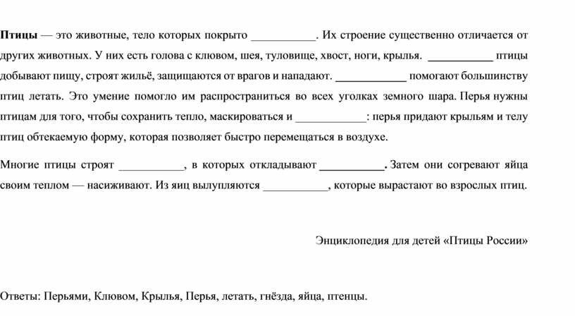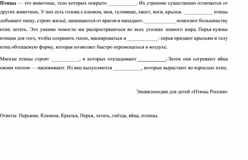 Ответы: Перьями, Клювом, Крылья, Перья, летать, гнёзда, яйца, птенцы.