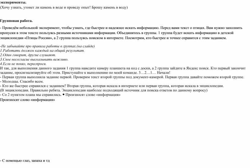 - Проведём небольшой эксперимент, чтобы узнать, где быстрее и надежнее искать информацию. Перед вами текст о птицах. Вам нужно заполнить пропуски в этом тексте пользуясь разными источниками информации. Объединитесь в группы. 1 группа будет искать информацию в детской энциклопедии «Птицы России», а 2 группа пользуясь поиском в интернете. Посмотрим, кто быстрее и точнее справится с этим заданием.