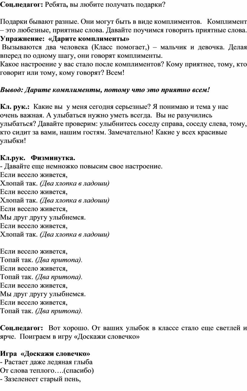 Соц.педагог: Вот хорошо. От ваших улыбок в классе стало еще светлей и ярче. Поиграем в игру «Доскажи словечко»
