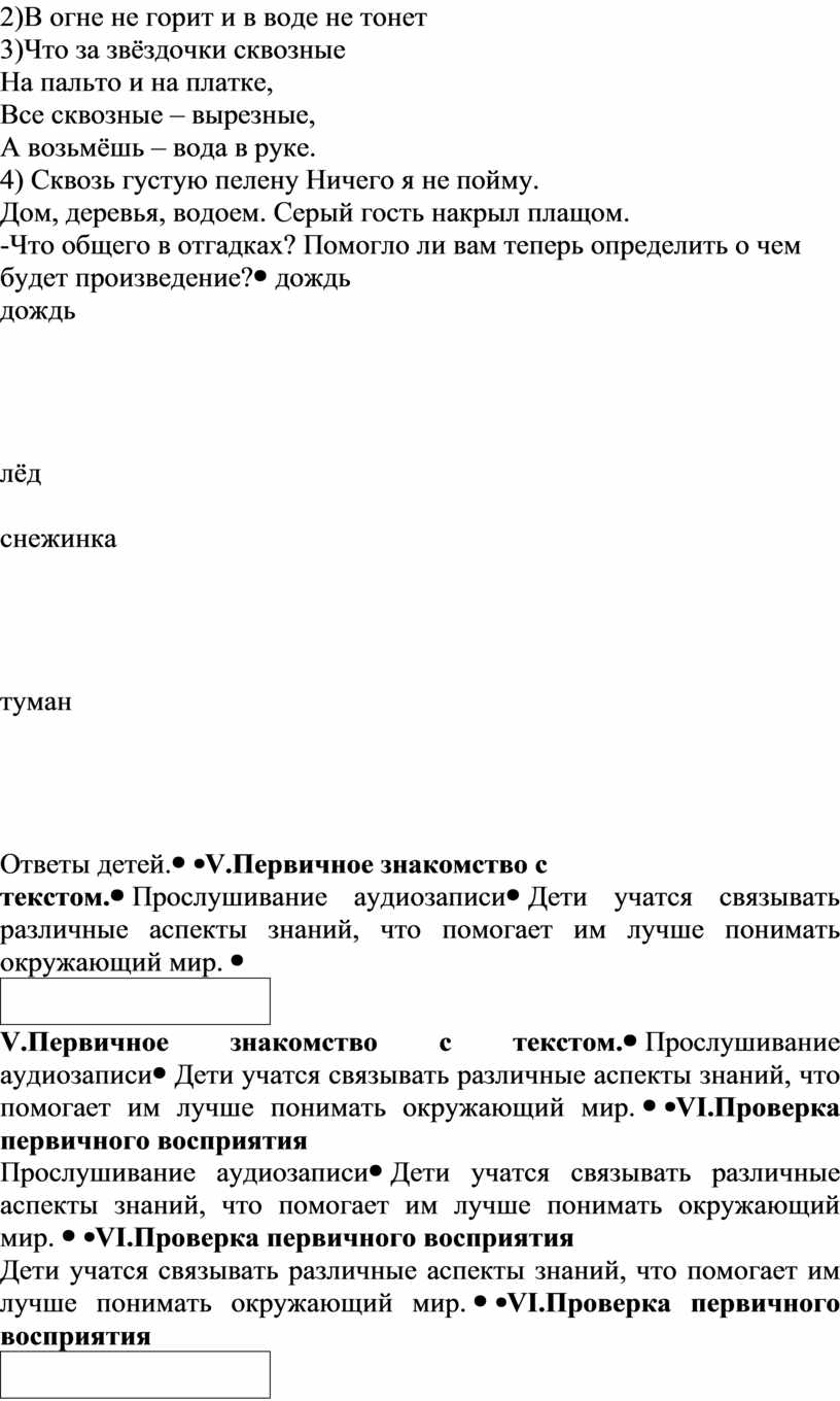 Дети отгадывают загадки: 1)Без пути и без дороги Ходит самый длинноногий, В тучах прячется, во мгле, Только ноги на земле. 2)В огне не горит и в воде не тонет 3)Что за звёздочки сквозные На пальто и на платке, Все сквозные – вырезные, А возьмёшь – вода в руке. 4) Сквозь густую пелену Ничего я не пойму. Дом, деревья, водоем. Серый гость накрыл плащом. -Что общего в отгадках? Помогло ли вам теперь определить о чем будет произведение? |