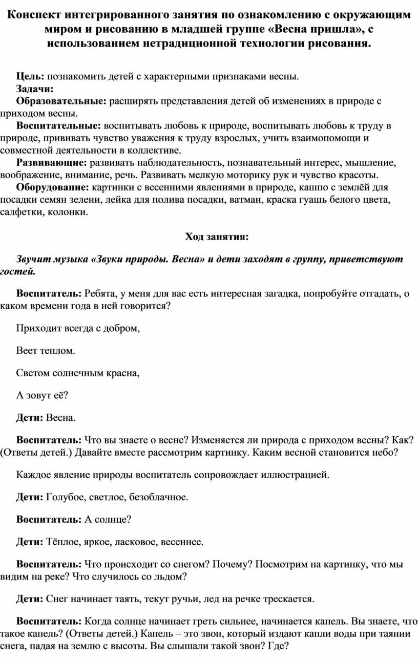 1.1 Конспект интегрированного занятия по ознакомлению с окружающим миром и рисованию, с использованием нетрадиционной технологии рисования, в младшей группе «Весна пришла»