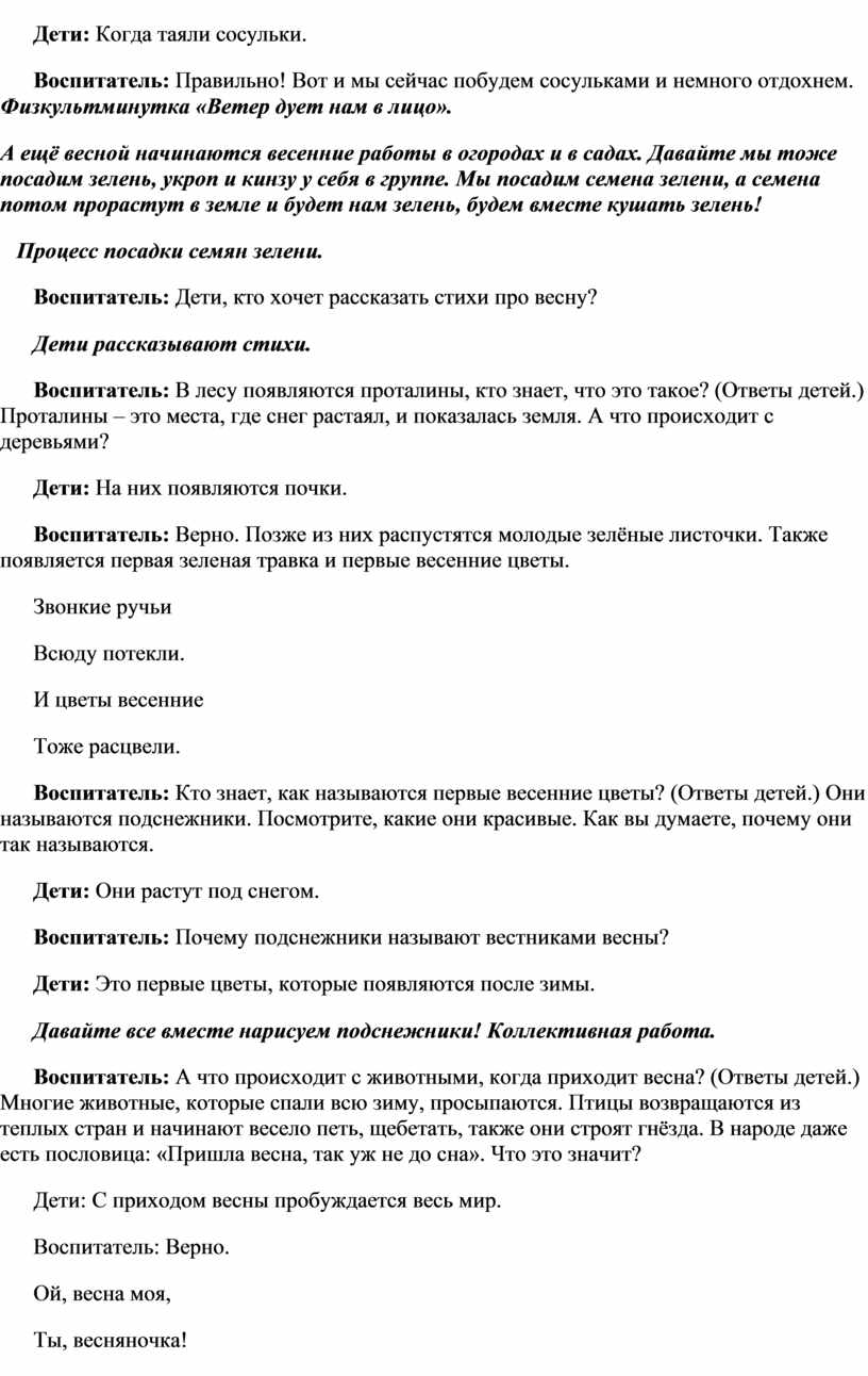 Воспитатель: Правильно! Вот и мы сейчас побудем сосульками и немного отдохнем. Физкультминутка «Ветер дует нам в лицо».