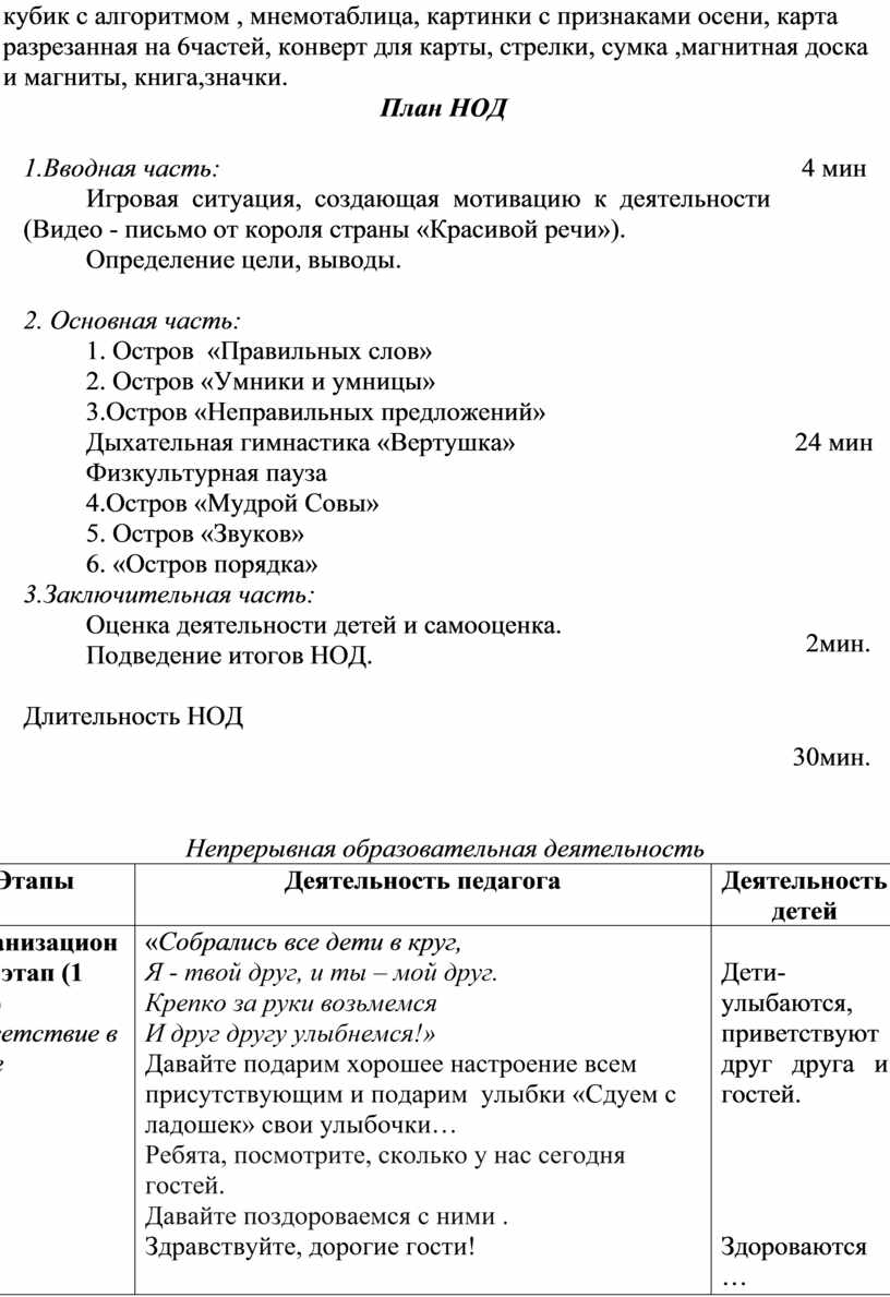 Материал и оборудование: Видео - письмо от короля ,картинки персонажей, вертушки, карточки с предложениями и рифмами, заданиями, кубик с алгоритмом , мнемотаблица, картинки с признаками осени, карта разрезанная на 6частей, конверт для карты, стрелки, сумка ,магнитная доска и магниты, книга,значки.