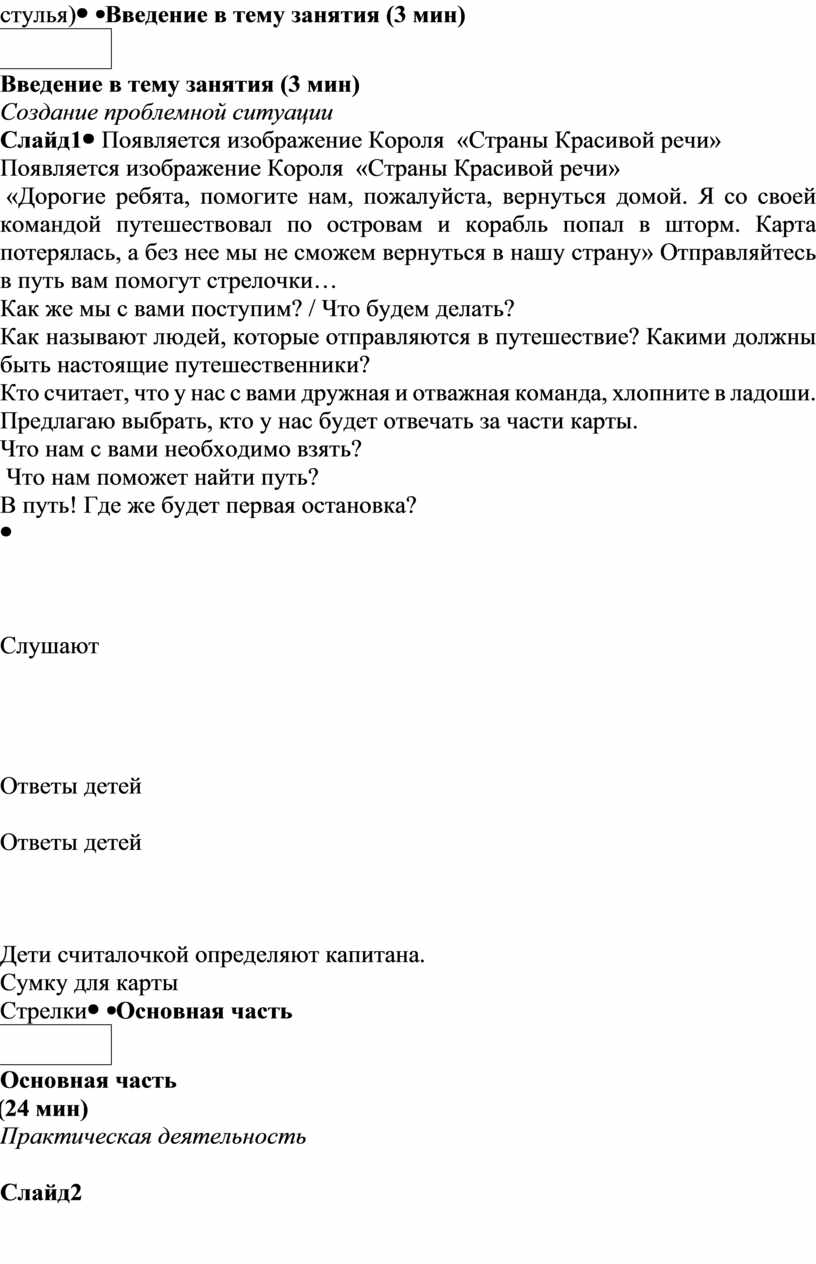 Появляется изображение Короля «Страны Красивой речи» «Дорогие ребята, помогите нам, пожалуйста, вернуться домой. Я со своей командой путешествовал по островам и корабль попал в шторм. Карта потерялась, а без нее мы не сможем вернуться в нашу страну» Отправляйтесь в путь вам помогут стрелочки… Как же мы с вами поступим? / Что будем делать? Как называют людей, которые отправляются в путешествие? Какими должны быть настоящие путешественники? Кто считает, что у нас с вами дружная и отважная команда, хлопните в ладоши. Предлагаю выбрать, кто у нас будет отвечать за части карты. Что нам с вами необходимо взять? Что нам поможет найти путь? В путь! Где же будет первая остановка?
