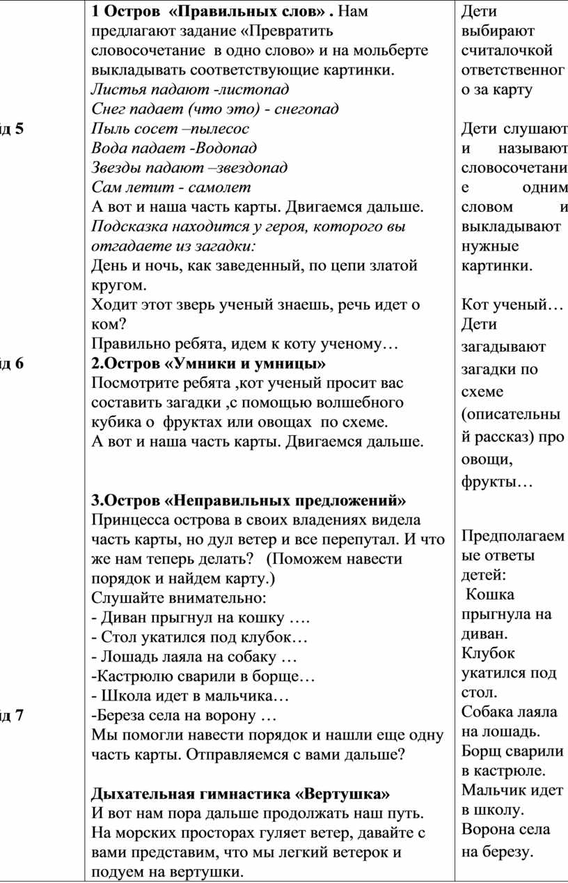 2. Основная часть: 1. Остров «Правильных слов» 2. Остров «Умники и умницы» 3.Остров «Неправильных предложений» Дыхательная гимнастика «Вертушка» Физкультурная пауза 4.Остров «Мудрой Совы» 5. Остров «Звуков» 6. «Остров порядка» 3.Заключительная часть: Оценка деятельности детей и самооценка. Подведение итогов НОД.