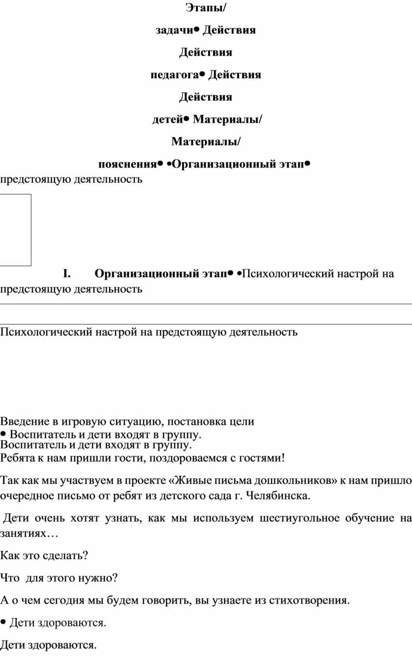 Воспитатель и дети входят в группу. Ребята к нам пришли гости, поздороваемся с гостями! Так как мы участвуем в проекте «Живые письма дошкольников» к нам пришло очередное письмо от ребят из детского сада г. Челябинска. Дети очень хотят узнать, как мы используем шестиугольное обучение на занятиях… Как это сделать? Что для этого нужно? А о чем сегодня мы будем говорить, вы узнаете из стихотворения.