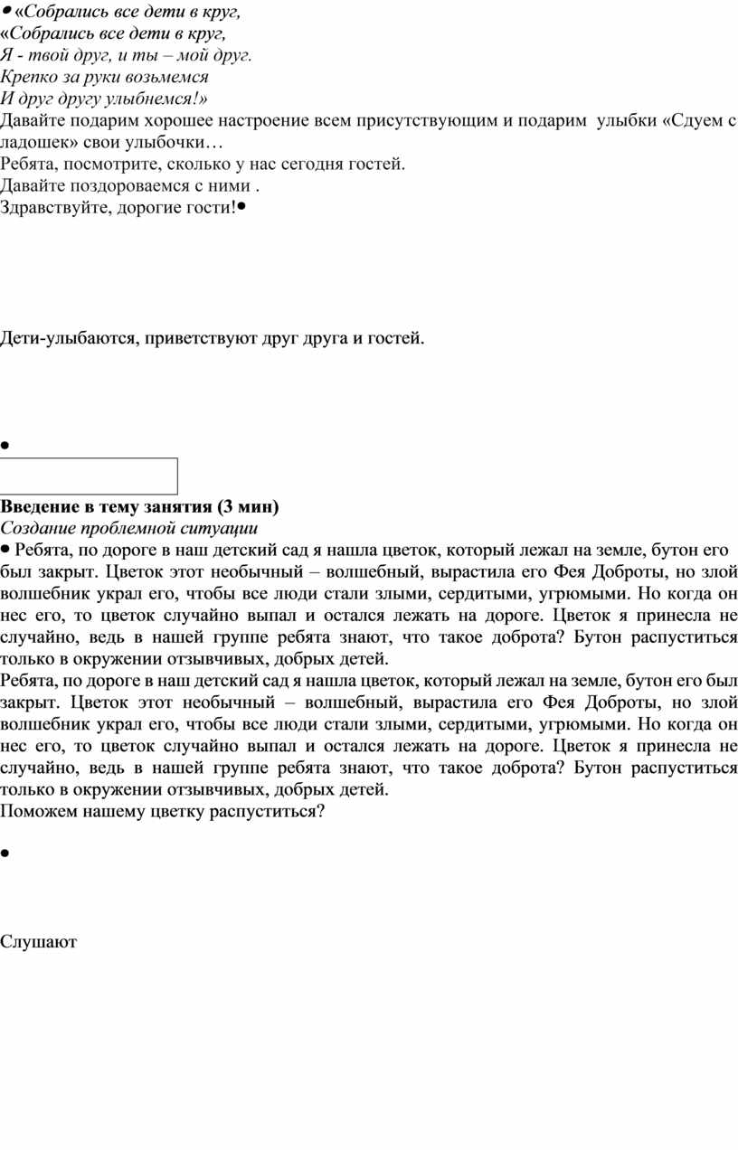 Ребята, по дороге в наш детский сад я нашла цветок, который лежал на земле, бутон его был закрыт. Цветок этот необычный – волшебный, вырастила его Фея Доброты, но злой волшебник украл его, чтобы все люди стали злыми, сердитыми, угрюмыми. Но когда он нес его, то цветок случайно выпал и остался лежать на дороге. Цветок я принесла не случайно, ведь в нашей группе ребята знают, что такое доброта? Бутон распуститься только в окружении отзывчивых, добрых детей. Поможем нашему цветку распуститься?