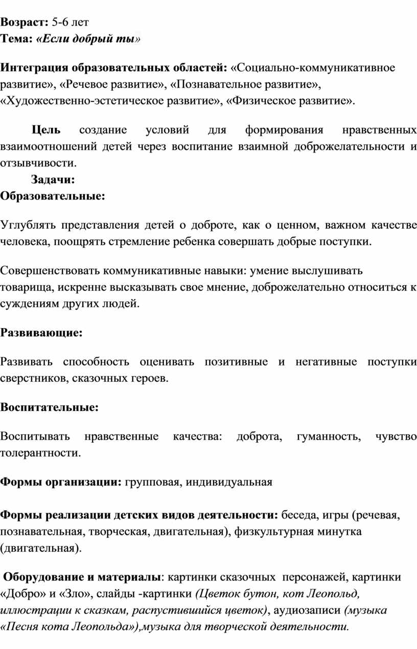 Оборудование и материалы: картинки сказочных персонажей, картинки «Добро» и «Зло», слайды -картинки (Цветок бутон, кот Леопольд, иллюстрации к сказкам, распустившийся цветок), аудиозаписи (музыка «Песня кота Леопольда»),музыка для творческой деятельности.