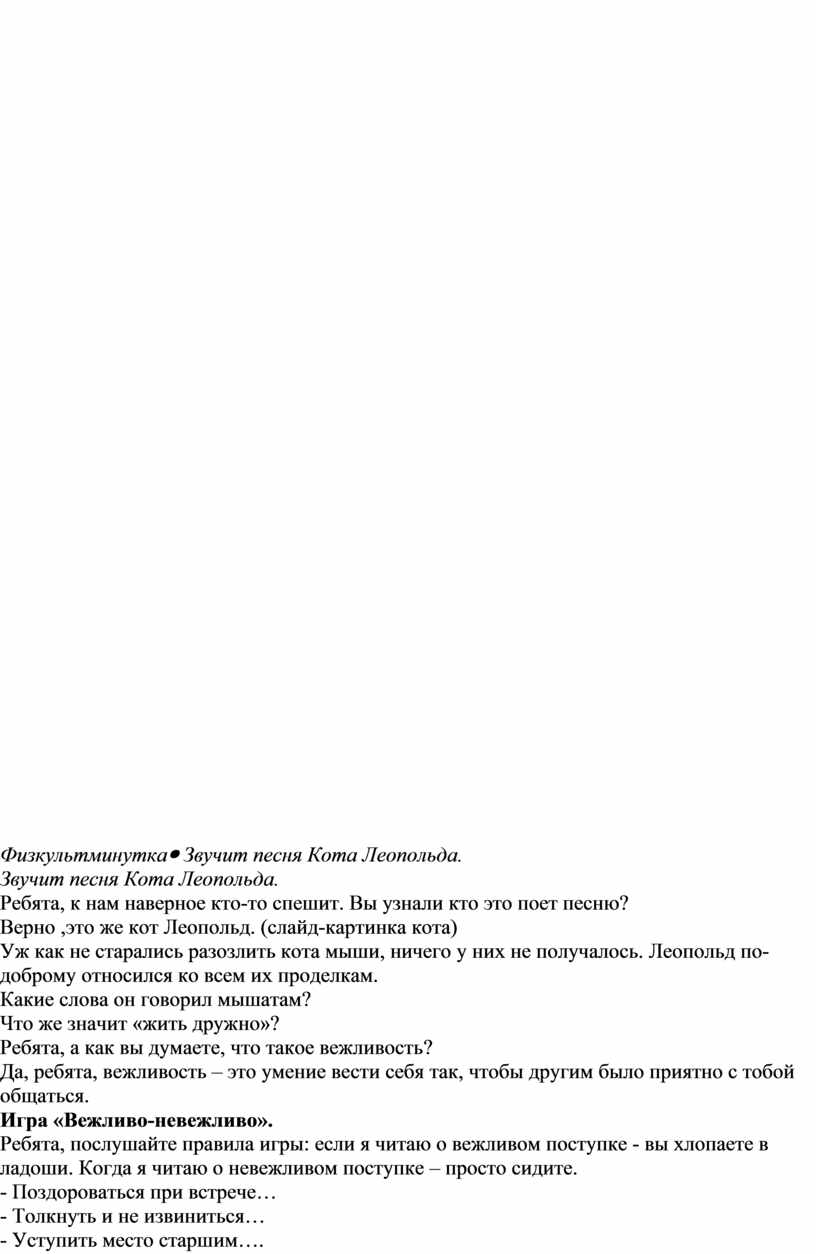 Звучит песня Кота Леопольда. Ребята, к нам наверное кто-то спешит. Вы узнали кто это поет песню? Верно ,это же кот Леопольд. (слайд-картинка кота) Уж как не старались разозлить кота мыши, ничего у них не получалось. Леопольд по-доброму относился ко всем их проделкам. Какие слова он говорил мышатам? Что же значит «жить дружно»? Ребята, а как вы думаете, что такое вежливость? Да, ребята, вежливость – это умение вести себя так, чтобы другим было приятно с тобой общаться. Игра «Вежливо-невежливо». Ребята, послушайте правила игры: если я читаю о вежливом поступке - вы хлопаете в ладоши. Когда я читаю о невежливом поступке – просто сидите. - Поздороваться при встрече… - Толкнуть и не извиниться… - Уступить место старшим…. - Свистеть, кричать, шуметь в детском саду… - Помочь подняться по лестнице…. - Попрощаться, уходя…. Молодцы ребята! Ребята, я предлагаю порадоваться друг за друга и построить пирамиду «Добрых поступков» из наших ладоней (педагог первым протягивает свои ладони в центр круга, дети по очереди кладут свои руки поверх уже лежащих. Когда последний ребёнок опускает свои ладони на вершину – пирамида рассыпается). - Что вы чувствовали, когда на ваши ладони опускались ладони друзей? Вот сколько добрых поступков мы совершаем! Кот Леопольд дружит со всеми сказочными персонажами. И он принес картинки героев из сказок. Но герои бывают добрые и злые, сердитые. Давайте мы с вами посмотрим кто у нас какой герой. Игра «Сказочный герой – добрый или злой?» Я предлагаю вам выбрать любую картинку со сказочным героем и разместить на доске на одну сторону добрых персонажей, на другую – злых … Злые герои не знают правил вежливости! Давайте научим их. Игра вопрос-ответ: