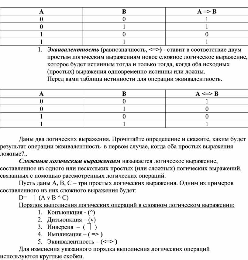 5. Эквивалентность (равнозначность, <=>) - ставит в соответствие двум простым логическим выражениям новое сложное логическое выражение, которое будет истинным тогда и только тогда, когда оба исходных (простых) выражения одновременно истинны или ложны.