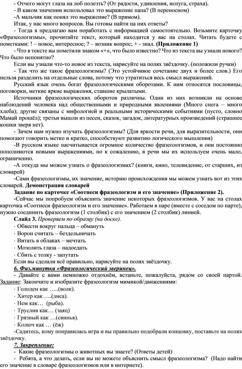 - Тогда я предлагаю вам поработать с информацией самостоятельно. Возьмите карточку «Фразеологизмы», прочитайте текст, который находится у вас на столах. Читать будете с пометками: ! – новое, интересное; ? – возник вопрос; + - знал. (Приложение 1)