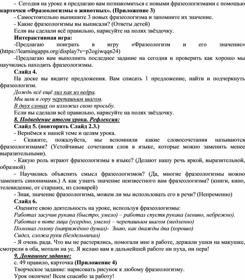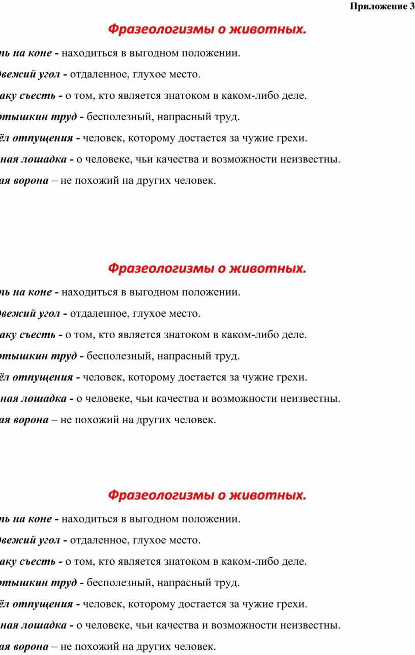 - Сегодня на уроке я предлагаю вам познакомиться с новыми фразеологизмами с помощью карточки «Фразеологизмы о животных». (Приложение 3)