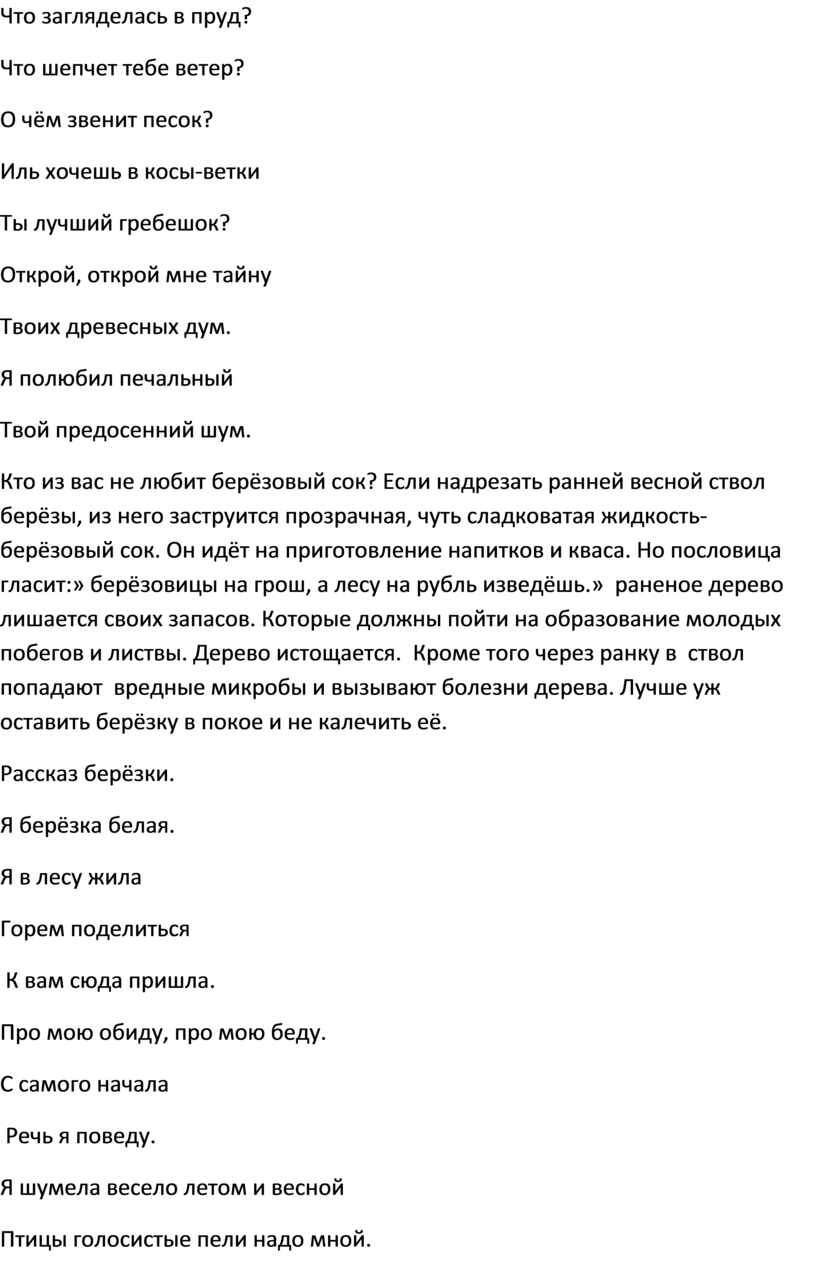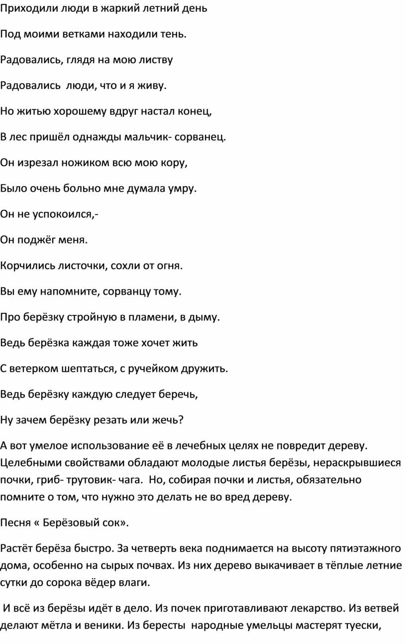 Кто из вас не любит берёзовый сок? Если надрезать ранней весной ствол берёзы, из него заструится прозрачная, чуть сладковатая жидкость- берёзовый сок. Он идёт на приготовление напитков и кваса. Но пословица гласит:» берёзовицы на грош, а лесу на рубль изведёшь.» раненое дерево лишается своих запасов. Которые должны пойти на образование молодых побегов и листвы. Дерево истощается. Кроме того через ранку в ствол попадают вредные микробы и вызывают болезни дерева. Лучше уж оставить берёзку в покое и не калечить её.