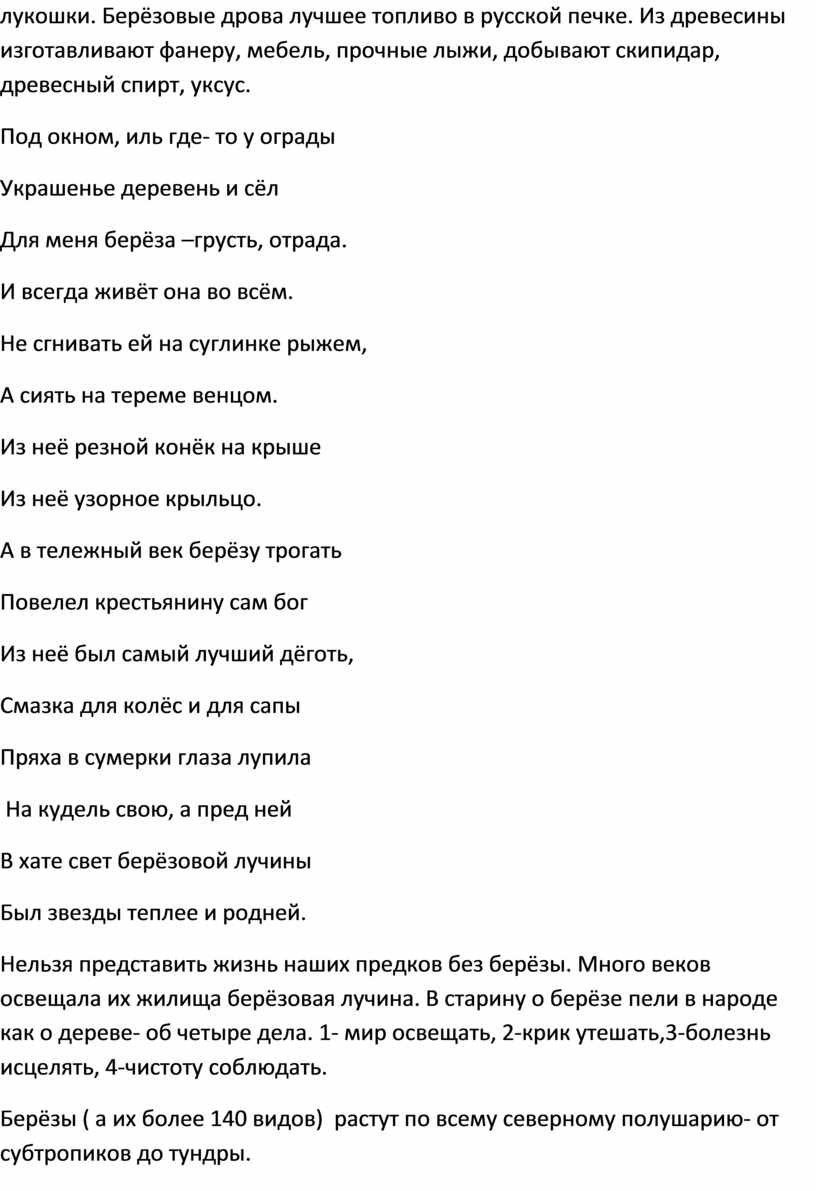 Нельзя представить жизнь наших предков без берёзы. Много веков освещала их жилища берёзовая лучина. В старину о берёзе пели в народе как о дереве- об четыре дела. 1- мир освещать, 2-крик утешать,3-болезнь исцелять, 4-чистоту соблюдать.