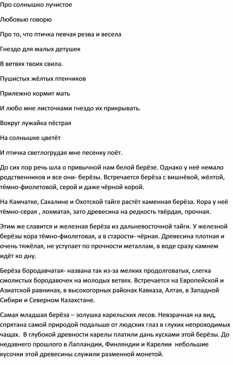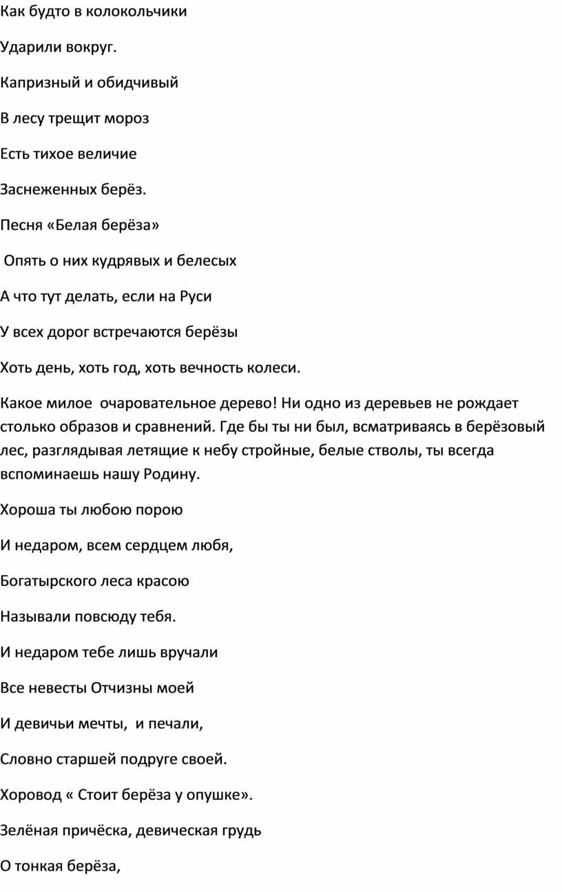 Какое милое очаровательное дерево! Ни одно из деревьев не рождает столько образов и сравнений. Где бы ты ни был, всматриваясь в берёзовый лес, разглядывая летящие к небу стройные, белые стволы, ты всегда вспоминаешь нашу Родину.