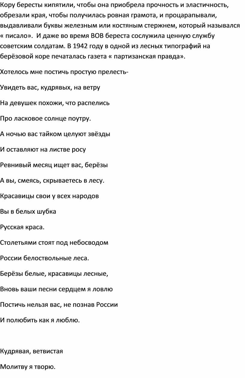 Кору бересты кипятили, чтобы она приобрела прочность и эластичность, обрезали края, чтобы получилась ровная грамота, и процарапывали, выдавливали буквы железным или костяным стержнем, который назывался « писало». И даже во время ВОВ береста сослужила ценную службу советским солдатам. В 1942 году в одной из лесных типографий на берёзовой коре печаталась газета « партизанская правда».