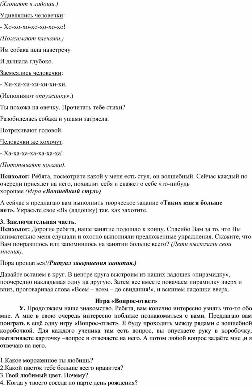 Психолог: Ребята, посмотрите какой у меня есть стул, он волшебный. Сейчас каждый по очереди присядет на него, похвалит себя и скажет о себе что-нибудь хорошее.(Игра «Волшебный стул»)