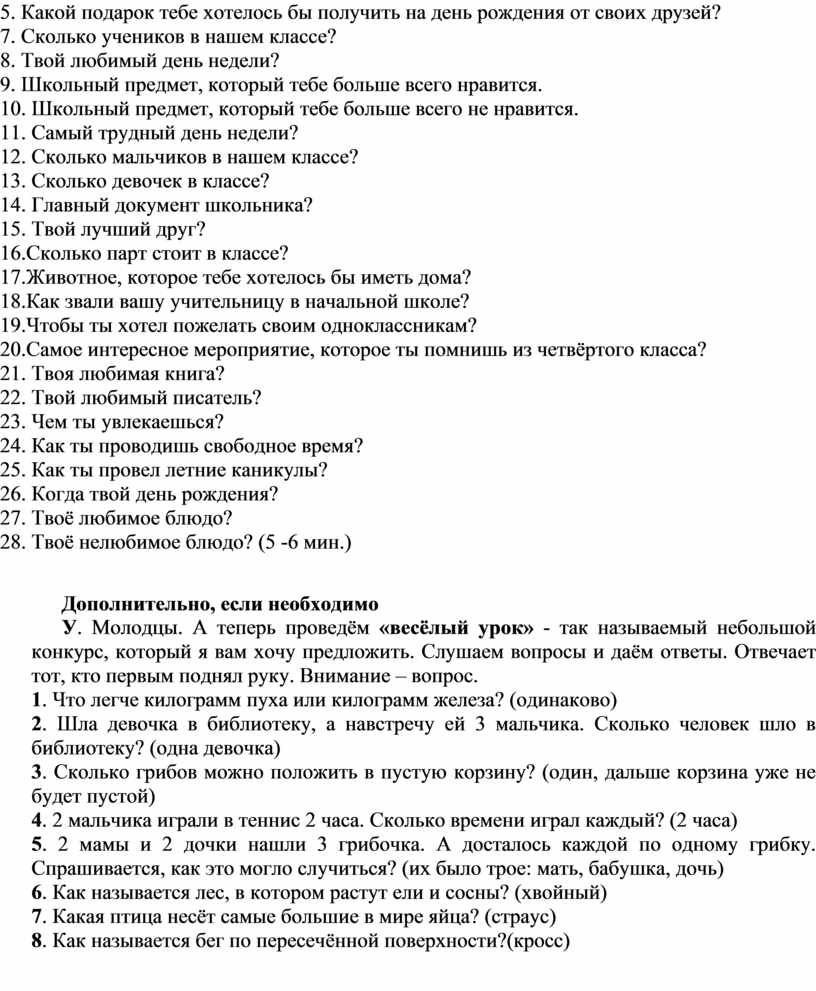 У. Молодцы. А теперь проведём «весёлый урок» - так называемый небольшой конкурс, который я вам хочу предложить. Слушаем вопросы и даём ответы. Отвечает тот, кто первым поднял руку. Внимание – вопрос.