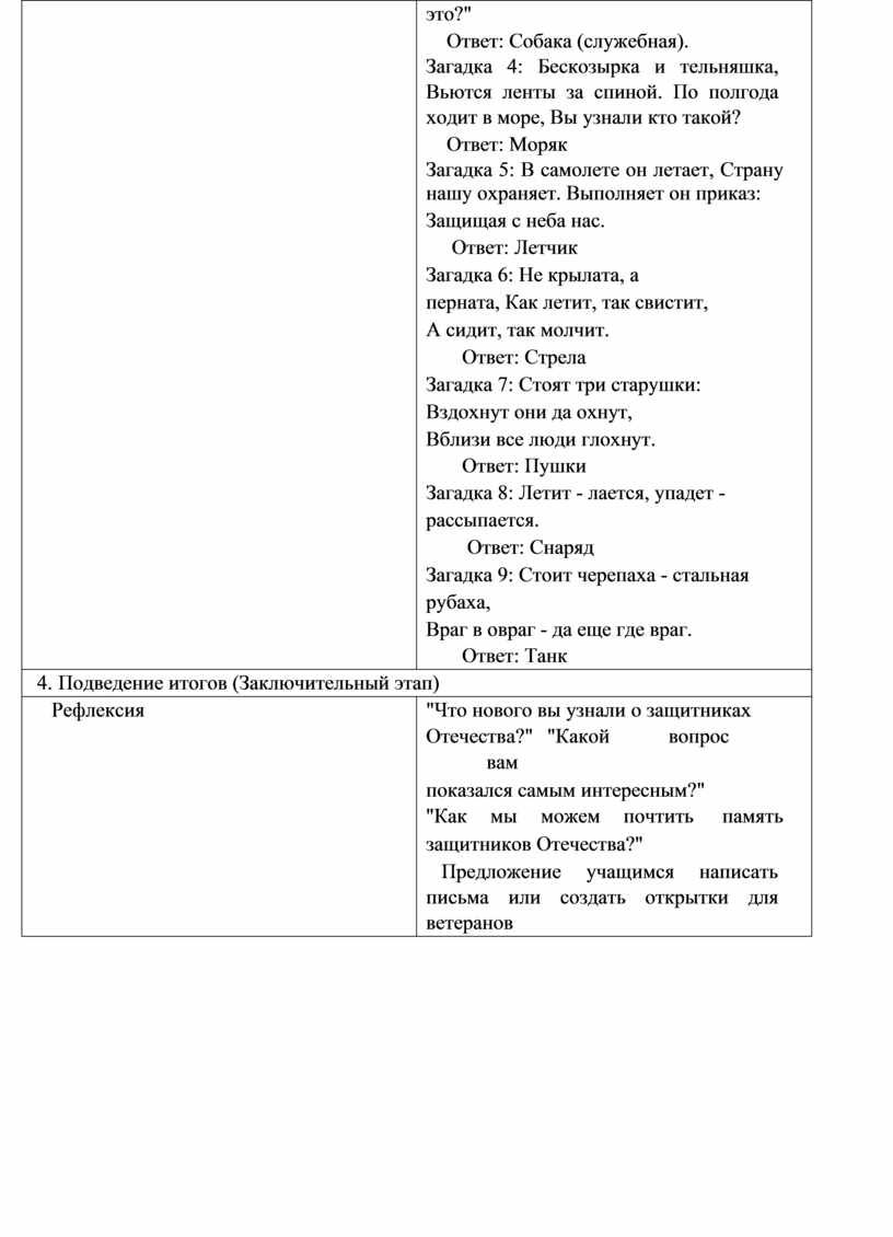 "Что нового вы узнали о защитниках Отечества?" "Какой вопрос вам показался самым интересным?" "Как мы можем почтить память защитников Отечества?" Предложение учащимся написать письма или создать открытки для ветеранов |