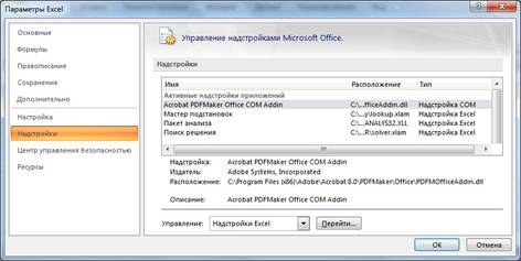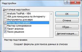 У діалоговому вікніНадстройки (рис. 2) в полі Доступные надстройки слід включити потрібну функцію надбудови та натиснути кнопку ОK.