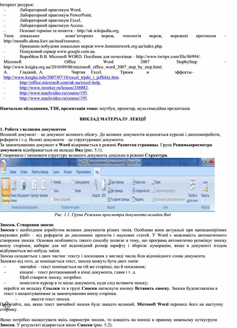 Міжпредметні зв’язки: Зв’язок із елементами знань і умінь таких навчальних дисциплін як «Вступ до фаху». Мета лекції полягає у формуванні в студентів системи знань у процесі роботи з великим документом та шаблонами, а також при створенні динамічних документів.