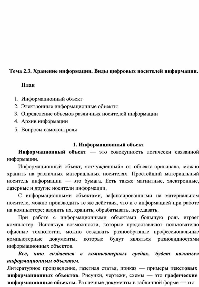Тема 2.3. Хранение информации. Виды цифровых носителей информации..... 15