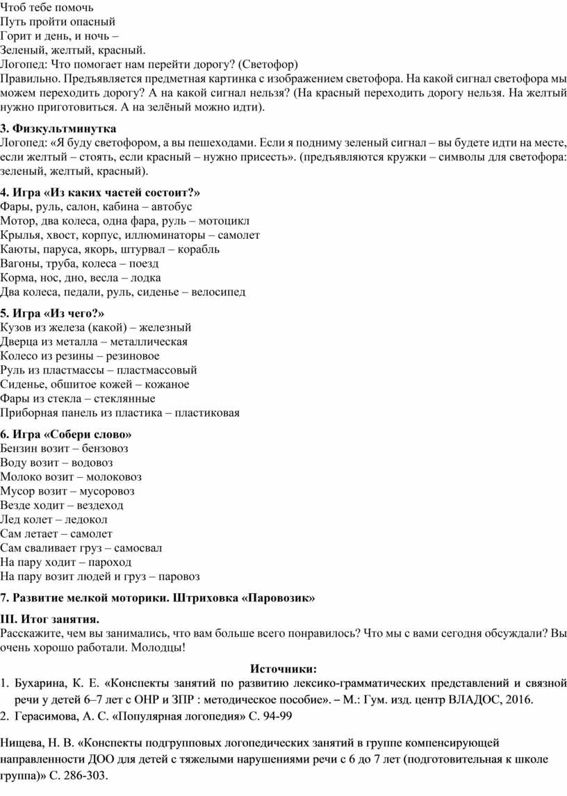 1. Бухарина, К. Е. «Конспекты занятий по развитию лексико-грамматических представлений и связной речи у детей 6–7 лет с ОНР и ЗПР : методическое пособие». – М.: Гум. изд. центр ВЛАДОС, 2016.