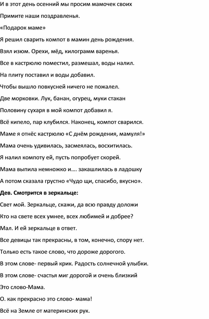 . Мама, мамочка... Сколько тепла таит это магическое слово, которым называют самого дорогого, близкого, единственного человека. Материнская любовь греет нас до старости. Мама учит нас быть мудрыми, дает советы, заботится о нас, оберегает нас. На дворе ноябрь, а мы говорим о маме. Обычно мы поздравляем мам восьмого марта. Почему же мы заговорили о них сегодня.