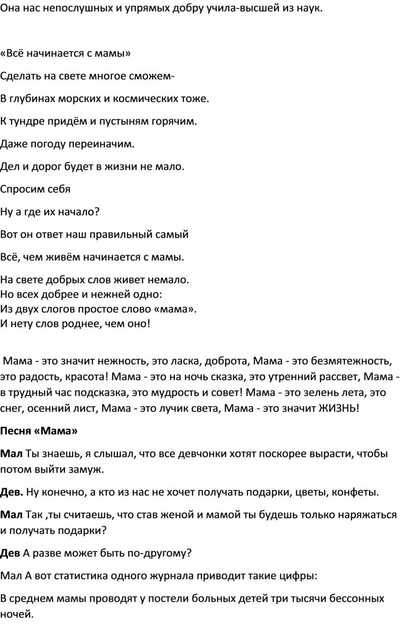 Сегодня мы рады приветствовать в этом зале наших дорогих гостей, самых милых, любимых и единственных- наших мам. С праздником, дорогие наши мамы! - Слово «мама» - особое слово. Оно рождается как бы вместе с нами, сопровождает нас в годы взросления и зрелости. Это первое слово, которое произносит человек и звучит оно одинаково нежно на всех языках. У мамы самое верное и чуткое сердце. В нем никогда не гаснет любовь, оно ни к чему не остаётся равнодушным. И сколько бы не было тебе лет, тебе всегда нужна мать, её ласка, её взгляд. И чем больше твоя любовь к матери, тем радостнее и светлее жизнь.