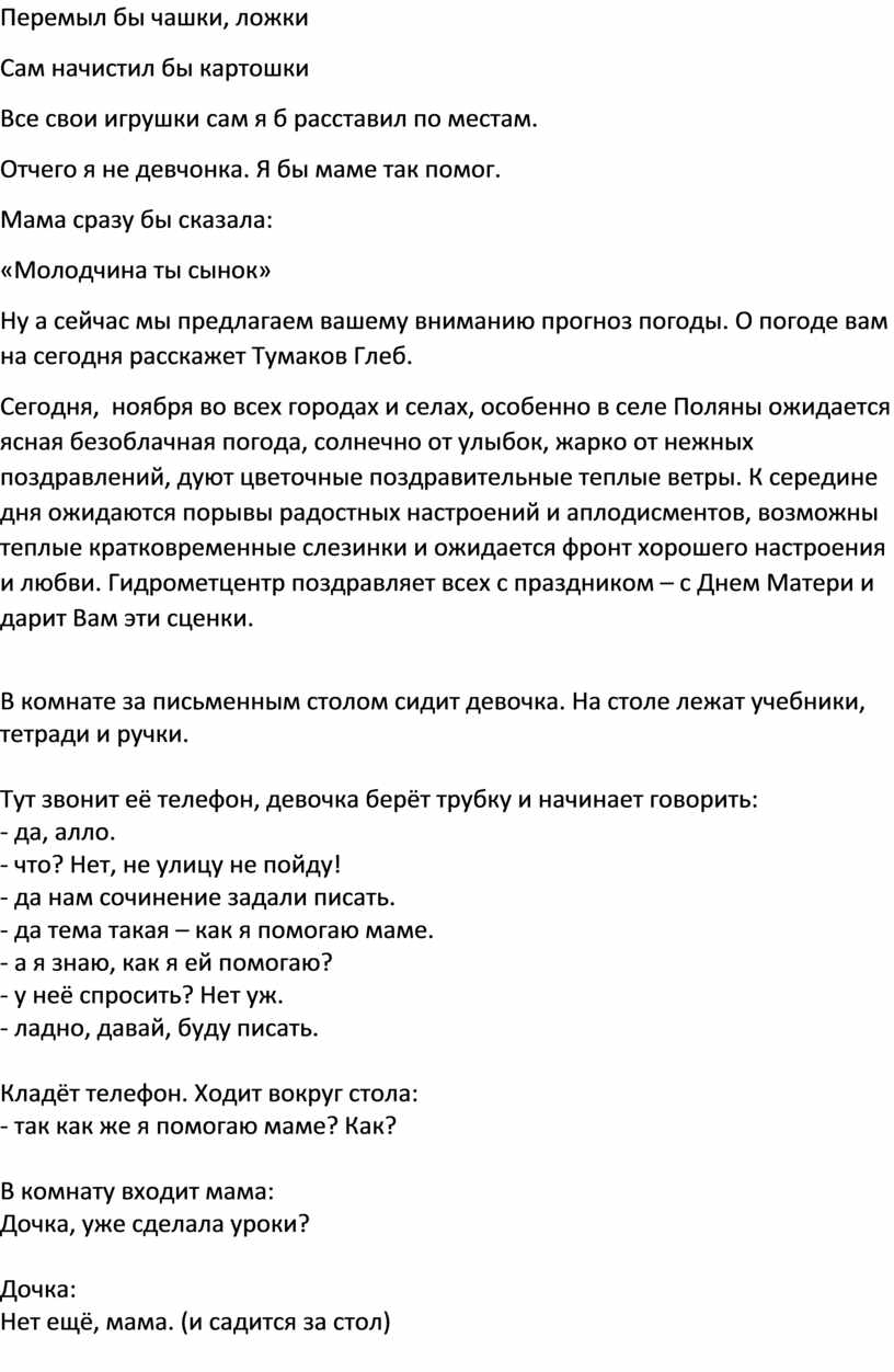Сегодня, ноября во всех городах и селах, особенно в селе Поляны ожидается ясная безоблачная погода, солнечно от улыбок, жарко от нежных поздравлений, дуют цветочные поздравительные теплые ветры. К середине дня ожидаются порывы радостных настроений и аплодисментов, возможны теплые кратковременные слезинки и ожидается фронт хорошего настроения и любви. Гидрометцентр поздравляет всех с праздником – с Днем Матери и дарит Вам эти сценки.