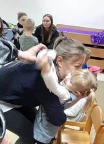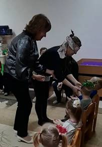 «Найди ребенка по ладошке». (Мамочкам завяжем глаза, и они должны по ладошке найти своего ребенка, только, ребята, не подсказывайте! По сигналу мамы начинают выполнять задание.