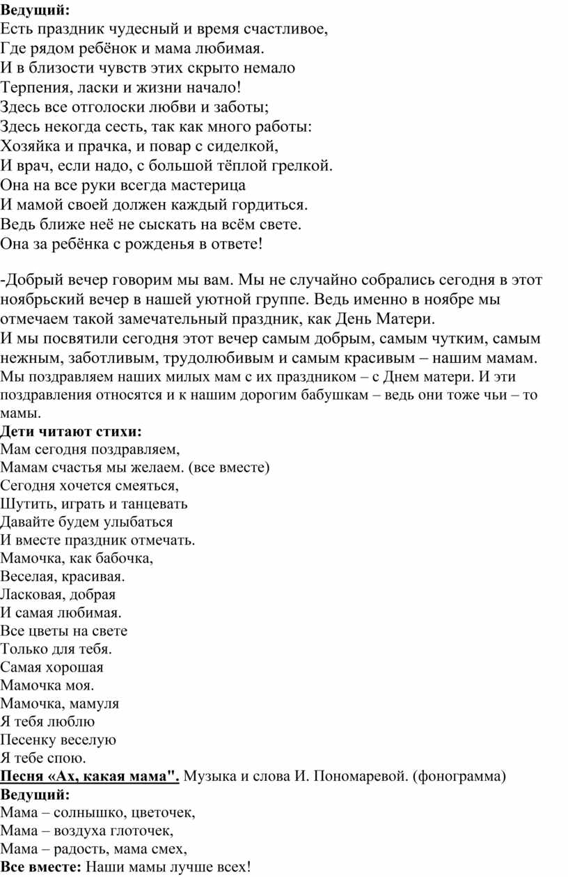 -Добрый вечер говорим мы вам. Мы не случайно собрались сегодня в этот ноябрьский вечер в нашей уютной группе. Ведь именно в ноябре мы отмечаем такой замечательный праздник, как День Матери.