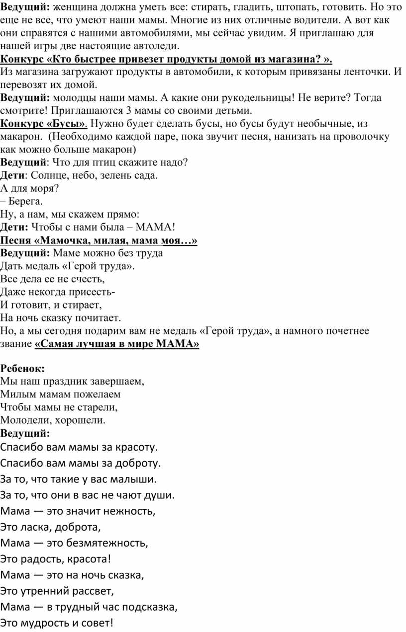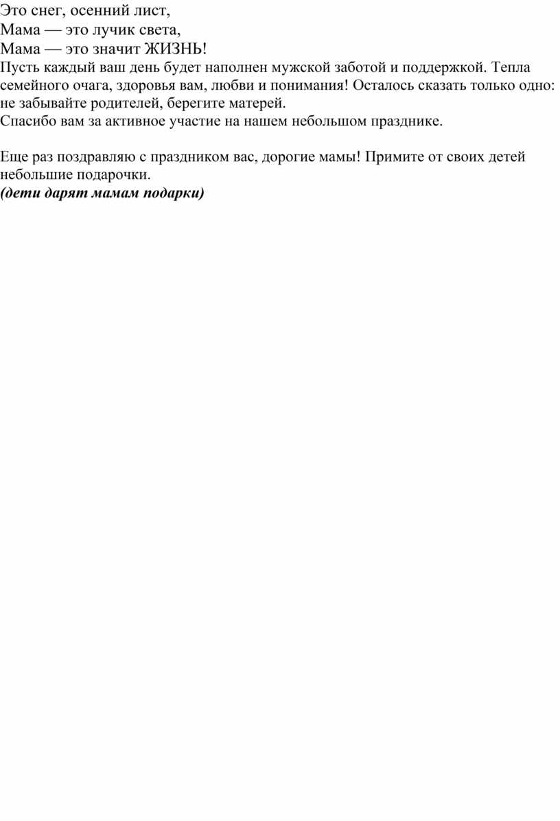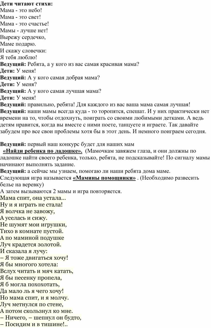 Ведущий: наши мамы всегда куда - то торопятся, спешат. И у них практически нет времени на то, чтобы отдохнуть, поиграть со своими любимыми детками. А ведь детям нравится, когда вы вместе с ними поете, танцуете и играете. Так давайте забудем про все свои проблемы хотя бы в этот день. И немного поиграем сегодня.