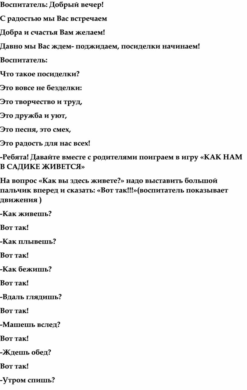 На вопрос «Как вы здесь живете?» надо выставить большой пальчик вперед и сказать: «Вот так!!!»(воспитатель показывает движения )