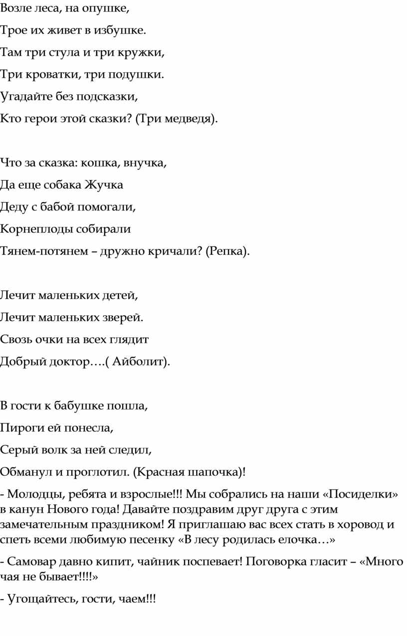 - Молодцы, ребята и взрослые!!! Мы собрались на наши «Посиделки» в канун Нового года! Давайте поздравим друг друга с этим замечательным праздником! Я приглашаю вас всех стать в хоровод и спеть всеми любимую песенку «В лесу родилась елочка…»