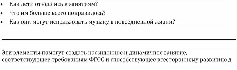 Эти элементы помогут создать насыщенное и динамичное занятие, соответствующее требованиям ФГОС и способствующее всестороннему развитию д