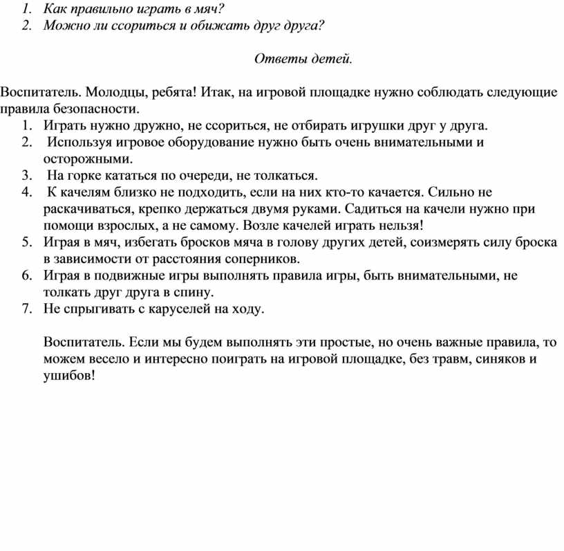 Воспитатель. Молодцы, ребята! Итак, на игровой площадке нужно соблюдать следующие правила безопасности.