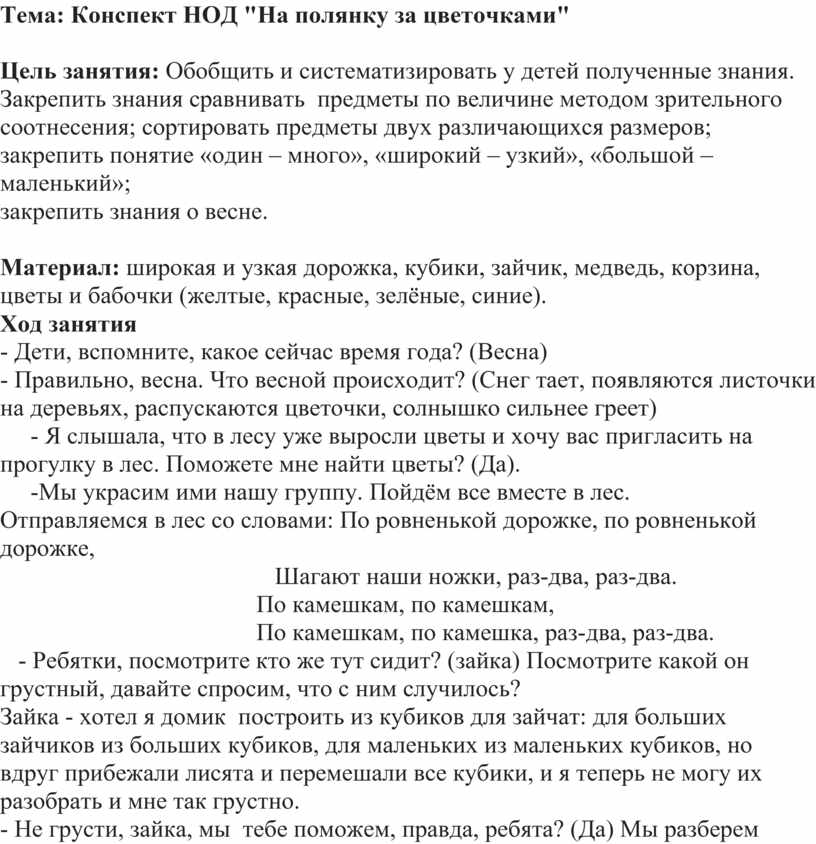 Материал: широкая и узкая дорожка, кубики, зайчик, медведь, корзина, цветы и