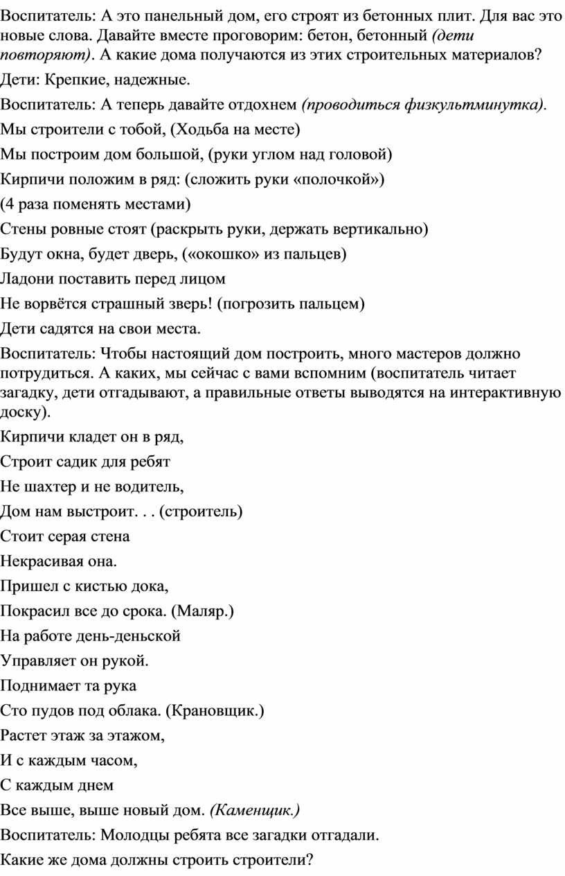 Воспитатель: Чтобы настоящий дом построить, много мастеров должно потрудиться. А каких, мы сейчас с вами вспомним (воспитатель читает загадку, дети отгадывают, а правильные ответы выводятся на интерактивную доску).
