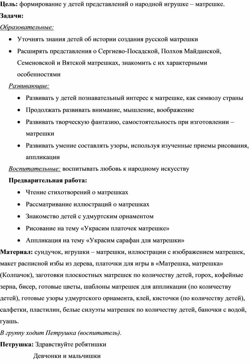 Материал: сундучок, игрушки – матрешки, иллюстрации с изображением матрешек, макет расписной избы из дерева, платочки для игры в «Матрешка, матрешка» (Колпачок), заготовки плоскостных матрешек по количеству детей, горох, кофейные зерна, бисер, готовые цветы, шаблоны матрешек для аппликации (по количеству детей), готовые узоры удмуртского орнамента, клей, кисточки (по количеству детей), салфетки, пластилин, белые силуэты матрешек по количеству детей, баночки с водой, гуашь.