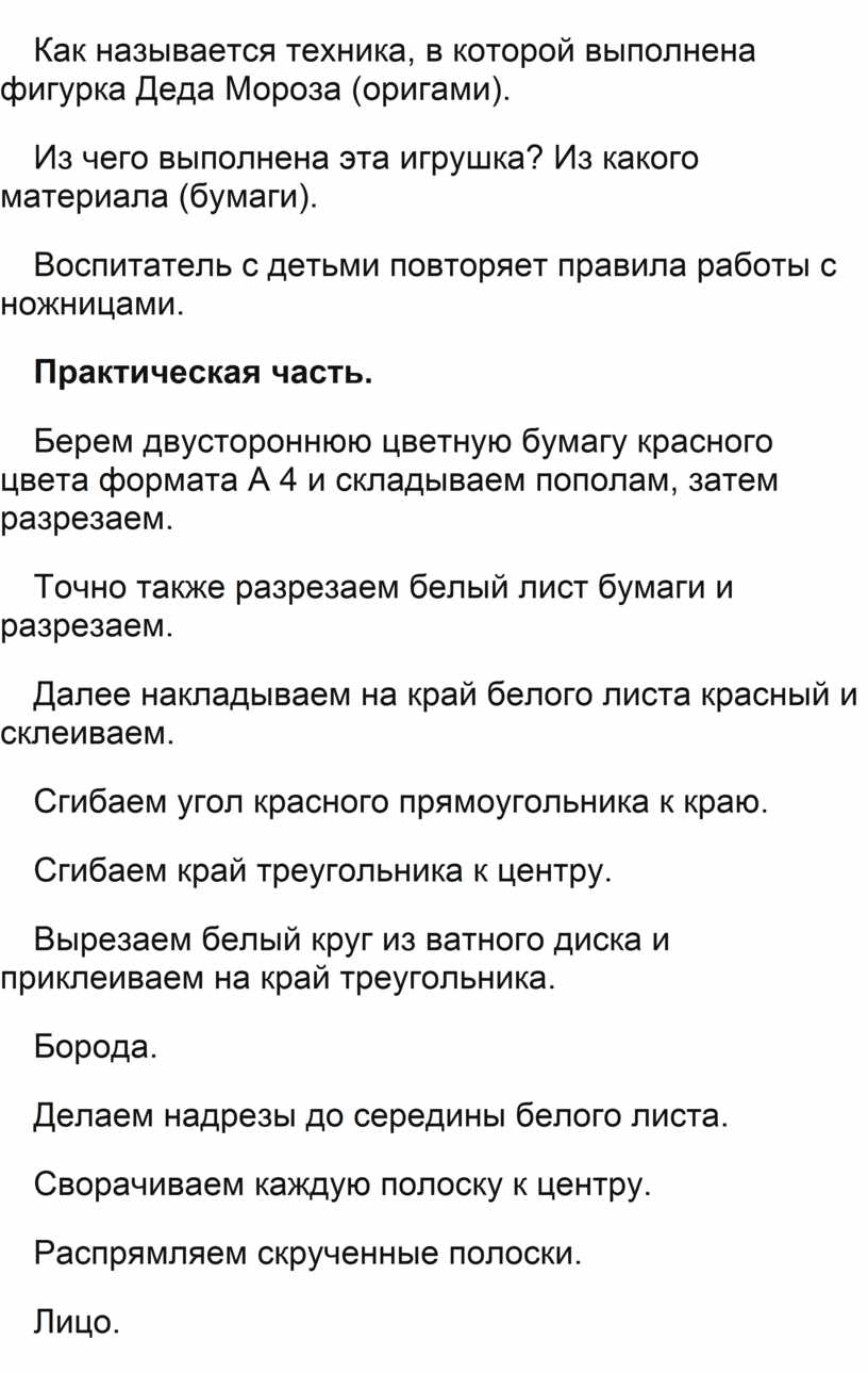 Предварительная работа: рассматривание иллюстраций с изображением новогоднего праздника, рассматривание плоскостных игрушек, конструкций фигурки Деда Мороза.