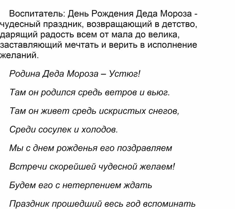 Воспитатель: День Рождения Деда Мороза - чудесный праздник, возвращающий в детство, дарящий радость всем от мала до велика, заставляющий мечтать и верить в исполнение желаний.