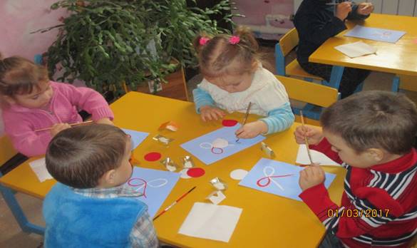 Воспитатель приглашает ребят за столы, раздает детям красные и белые детали мэрцишоров. Дети выполняют аппликацию.