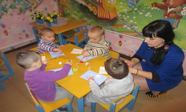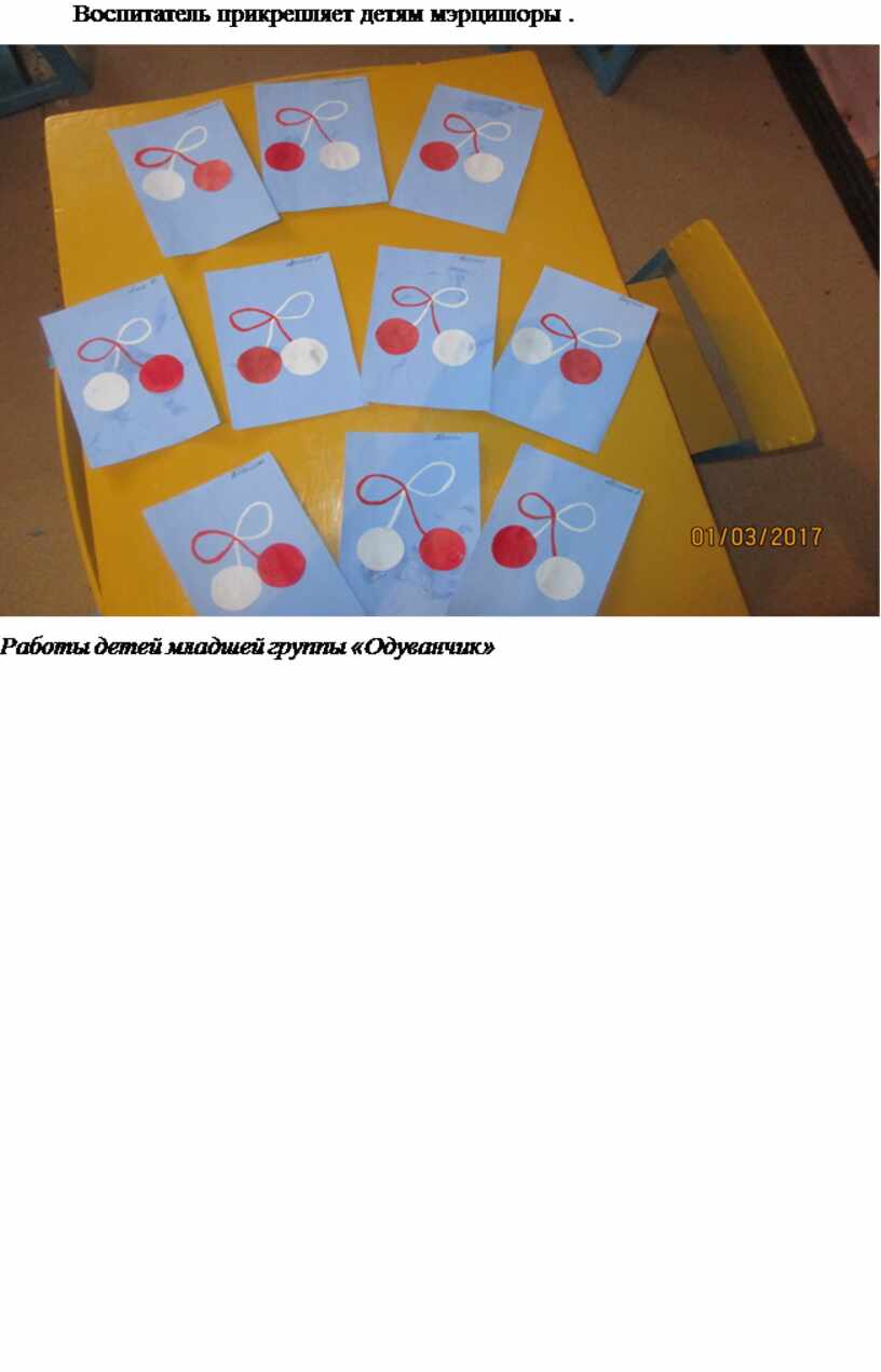 Воспитатель прикрепляет детям мэрцишоры .