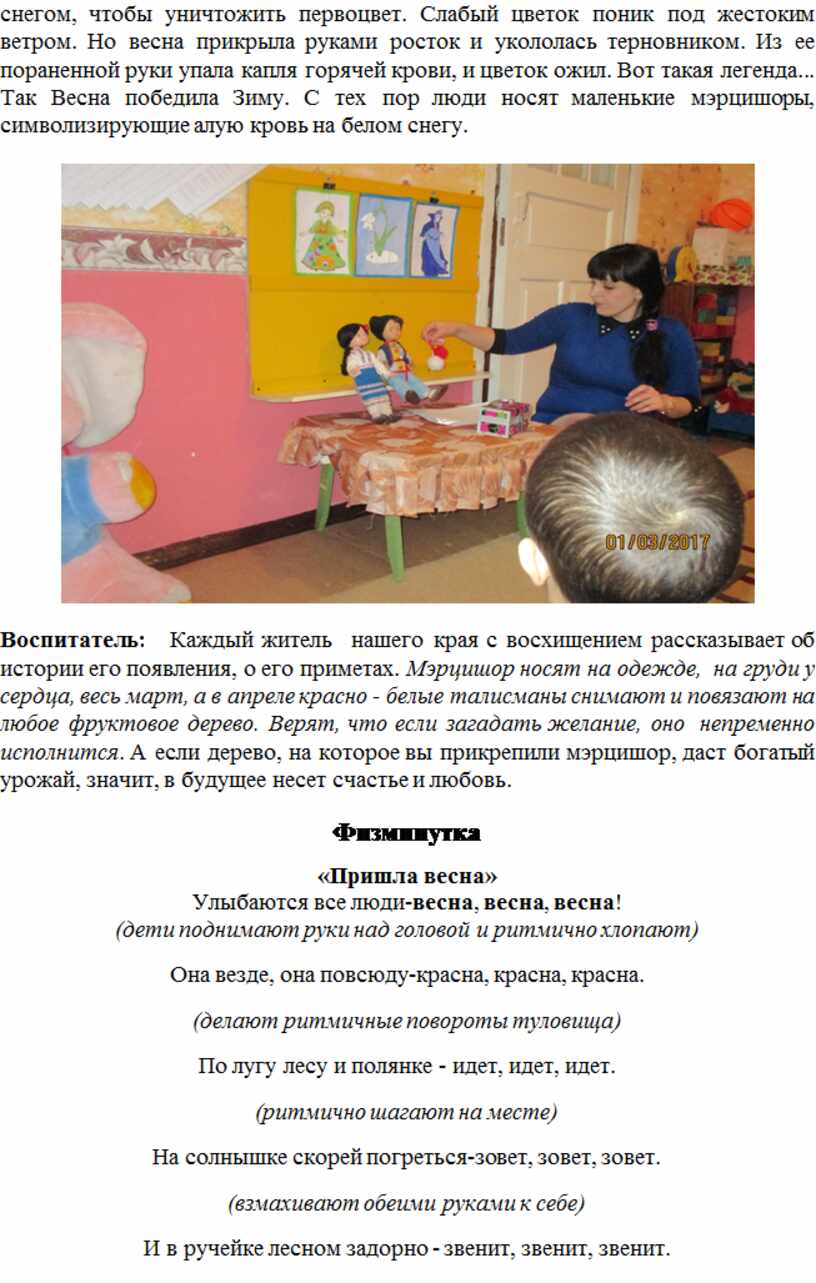 Воспитатель: Каждый житель нашего края с восхищением рассказывает об истории его появления, о его приметах. Мэрцишор носят на одежде, на груди у сердца, весь март, а в апреле красно - белые талисманы снимают и повязают на любое фруктовое дерево. Верят, что если загадать желание, оно непременно исполнится. А если дерево, на которое вы прикрепили мэрцишор, даст богатый урожай, значит, в будущее несет счастье и любовь.